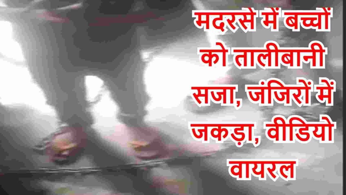 अलीगढ़। मदरसे में इस्लामी शिक्षा के नाम पर छोटे-छोटे बच्चों को तालीबानी सजा दी जा रही है। यह सजा मदरसों में पढ़ाई के नाम पर बच्चों को वहां के मौलवियों की तरफ से तालीबानी सजा दी जा रही है। इन दिनों सोशल मिडिया पर एक वीडियो तेजी से वायरल हो रहा है। इस वीडियों में कुछ बच्चों को एक मदरसे के मौलवी ने जंजीरों में बांध रखा है।