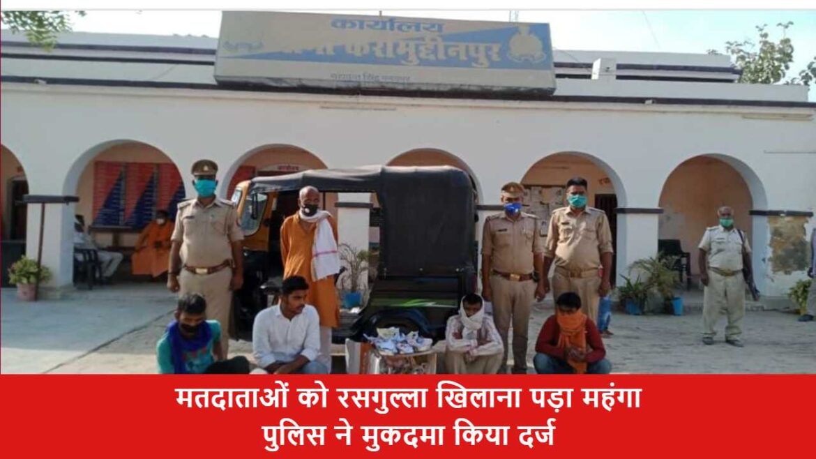 इसी बीच एक आटो में 100 पैकेट रसगुल्ला बरामद किया गया।पुलिस ने बताया की रसगुल्ला के प्रत्येक पैकेट पर ढुढ़िया प्रधान पद के प्रत्याशी शिवजी सिंह का पम्पलेट चस्पा किया गया था।वही पांच लोग कोविड प्रोटोकॉल को दरकिनार कर बगैर मास्क के मतदाताओं के बीच रसगुल्ला का पैकेट वितरण कर पक्ष में वोट करने को कह रहे थे।पुलिस ने बताया की पकड़े गये आटो को सीज कर दिया गया है।