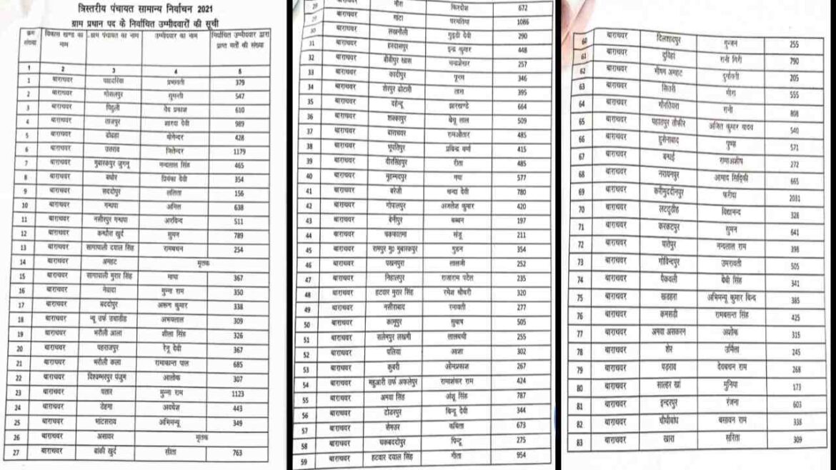 निहालपुर राजाराम पटेल 235, हटावर मुरार सिंह रमेश चौधरी 320, नसीराबाद रमावती 277,कामूपुर सुबाष 505,सलेमपुर लखमी लालबची 255, पलिया आशा 302,कुबरी ओमप्रकाश 267,महुआरी उर्फ अफलेपुर रामांशंकर राम 424, अमवा सिंह अंशू सिंह 787,टोडरपुर विंदू देवी 344, सेमउर कविता673, चकबददोपुर पिन्टू 275, हटावर दयाल सिंह गीता 954, दिलसादपुर गुन्जन 255, दुविहां रानी गिरी 790, भीषम अमहट दुर्गावती205, सिऊरी मीरा 555, गौरतियरा रानी 808 ,